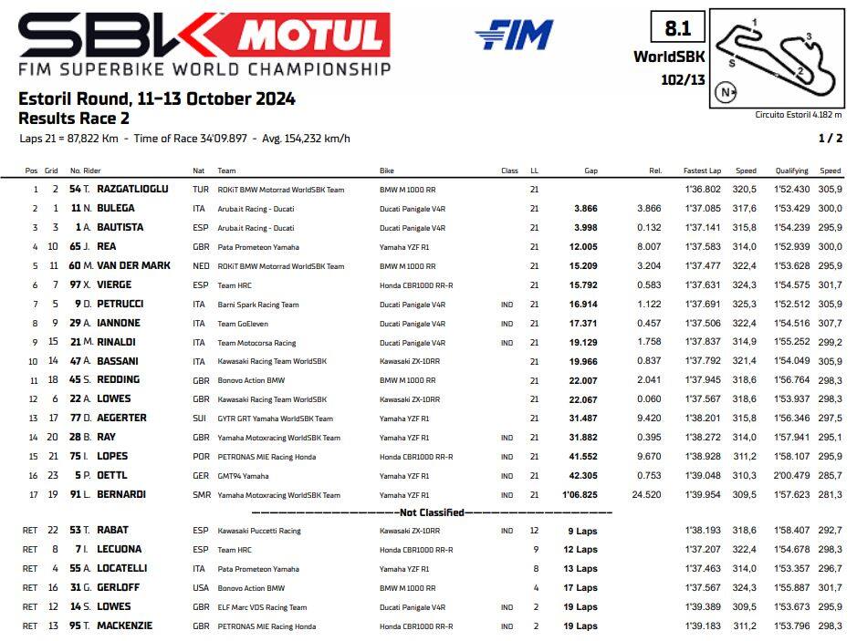 In Gara 2 Razgatlioglu si è imposto con margine dopo aver gestito la situazione nei primi giri, senza lasciare scampo alla coppia delle Ducati Aruba. Bautista ha fatto da scudiero a Bulega senza mai attaccarlo per il secondo posto, consentendogli di arrivare a Jerez con quarantasei punti di ritardo da Toprak, aritmeticamente ancora in corsa per il titolo. Scivolati Andrea Locatelli e Iker Lecuona, il quarto posto è stato appannaggio di Jonathan Rea, al miglior risultato dell’anno in una gara lunga. Top five per Michael Van Der Mark, mentre Xavi Vierge in sesta posizione ha preceduto un quartetto italiano con Danilo Petrucci, Andrea Iannone, Michael Ruben Rinaldi e Axel Bassani.