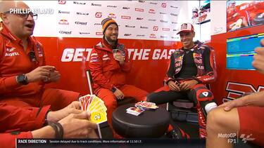 - Per ingannare l'attesa si sono organizzate anche partite a carte, come al box GasGas, dove tra gli altri 'Pigiamino' Giribuola e Augusto Fernandez si sono sfidati a 'Uno'. GUARDA IL VIDEO