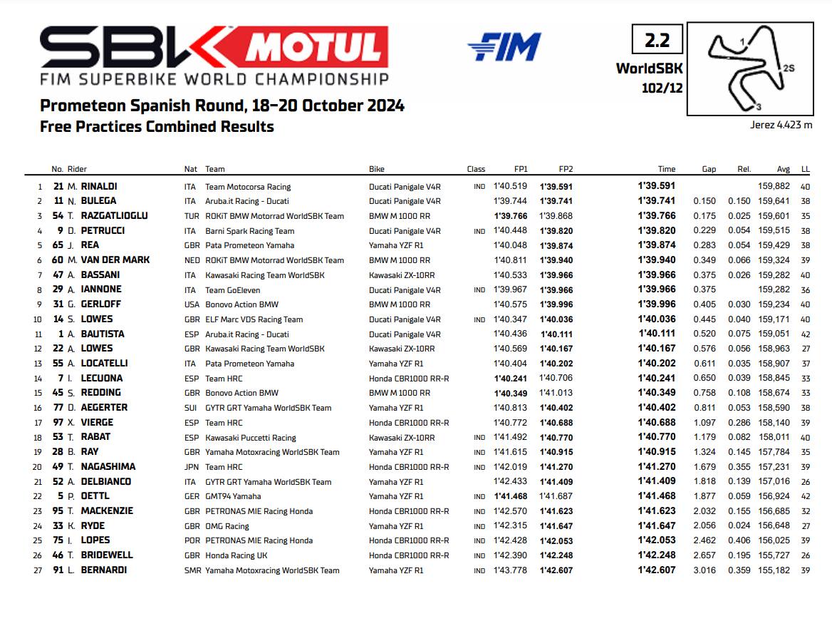Gli occhi degli appassionati sono puntati, ovviamente, sul duello tra i suoi inseguitori. Bulega ha impressionato fin dalla mattinata, ma Toprak gli è stato alle calcagna. Se il mondiale è (oggettivamente) indirizzato verso la Turchia, le gare del weekend potrebbero regalare grande spettacolo. Non va sottovalutato in tal senso Danilo Petrucci, quarto davanti a Jonathan Rea (anche lui con la SCQ) e Michael Van Der Mark. La coppia italiana formata da Axel Bassani (7°) e Andrea Iannone (8°) dà buone sensazioni e precede Garrett Gerloff e Sam Lowes, mentre Alvaro Bautista manca la top ten e chiude undicesimo. Andrea Locatelli conclude in tredicesima posizione, con Alessandro Delbianco ventunesimo (nonché autore di una scivolata in FP2) e Luca Bernardi ventisettesimo.
