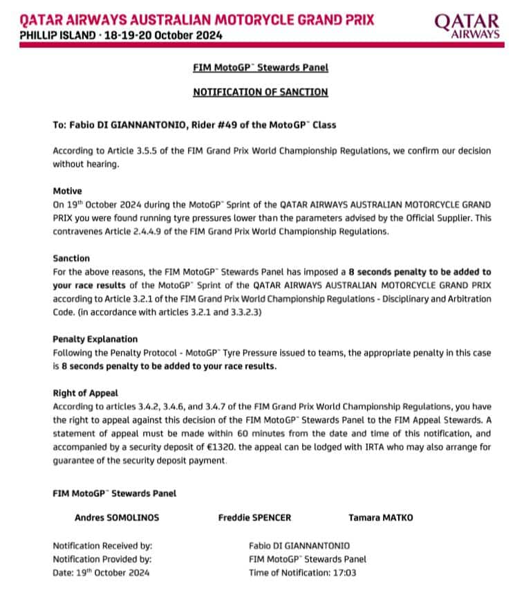 Il pilota del Pertamina Enduro VR46 Racing Team è stato autore di una gara super: partito 12°, è riuscito a risalire al 5° posto con una serie di sorpassi da manuale. Ma dopo l'arrivo è stato messo sotto investigazione per 'tyre pressure' e alla fine è stato retrocesso in 7^ posizione per pressione irregolare delle gomme, appunto.