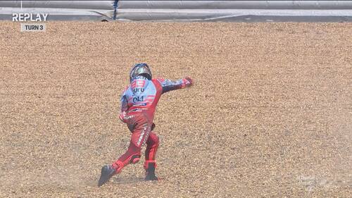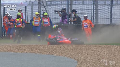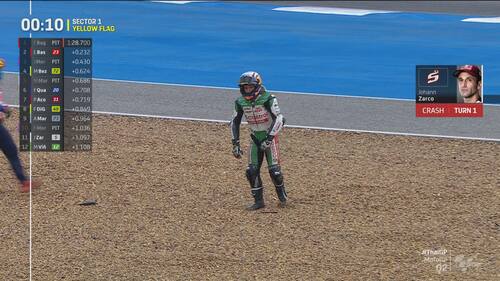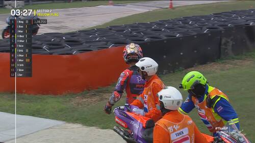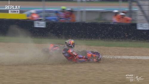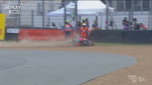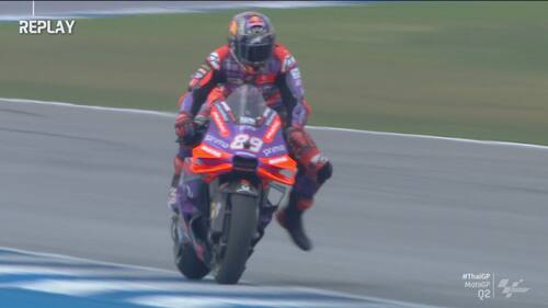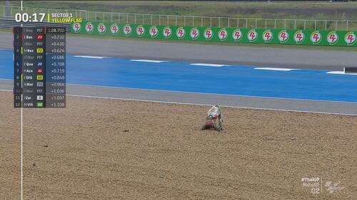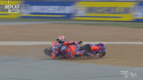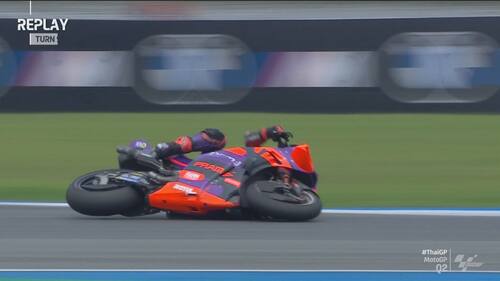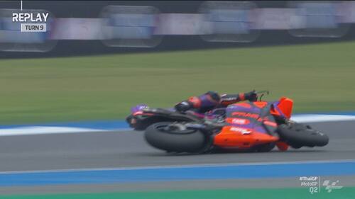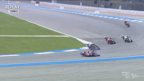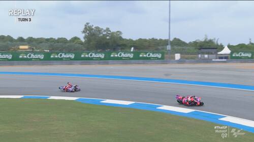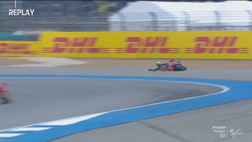 Q2 molto movimentato in Thailandia, con diverse cadute nel finale di sessione. Jorge Martin e Marc Marquez sono finiti nella ghiaia a pochi secondi di distanza l'uno dall'altro, seguiti da Morbidelli e Zarco. Il leader del Mondiale scatterà in prima fila dalla terza casella, il pilota Gresini in 5^ posizione. Di seguito le foto e i video delle cadute dei piloti durante le qualifiche
