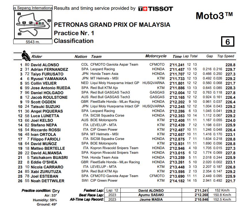 Moto3, la classifica dei tempi del venerdì a Sepang