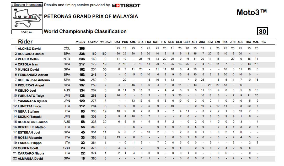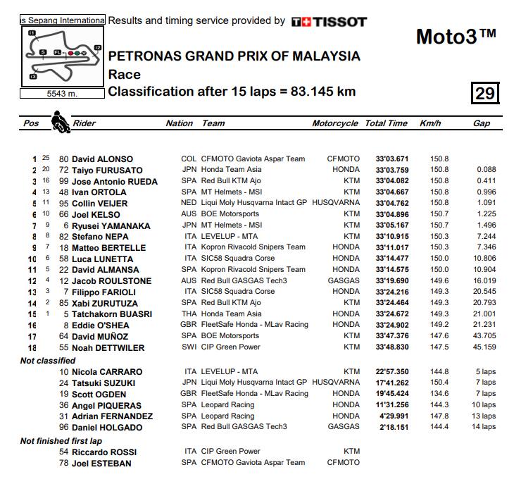 Gli italiani non sono entrati nella lotta per il podio, poteva riuscirci Lunetta, partito bene, ma il pilota di Simoncelli è scivolato subito indietro. In pochi giri s’è ritrovato quindicesimo, probabilmente rallentato da alcune cadute. Luca ha poi chiuso al decimo posto dietro a Bertelle e Nepa. Rossi è finito fuori gara al via, per il contatto con Esteban, Carraro è caduto al decimo giro. La lotta per il secondo posto nel Mondiale, tra Holgado e Veijer (arrivati in Malesia a pari punti), ha premiato l’olandese che ha chiuso in quinta posizione.