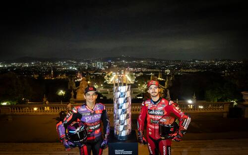 Prima di contendersi il titolo in pista questo weekend per l'ultimo GP della stagione, Martin e Bagnaia hanno posato a Barcellona davanti al Museo Nazionale dell'arte della Catalunya (MNAC), sede dei MotoGP Awards di quest'anno. Presenti anche le compagne dei due piloti, Domizia Castagnini (moglie di Pecco) e Maria Monfort Matutes (fidanzata di Jorge). Il GP Barcellona domenica alle 14 in diretta su Sky Sport MotoGP e in streaming su NOW