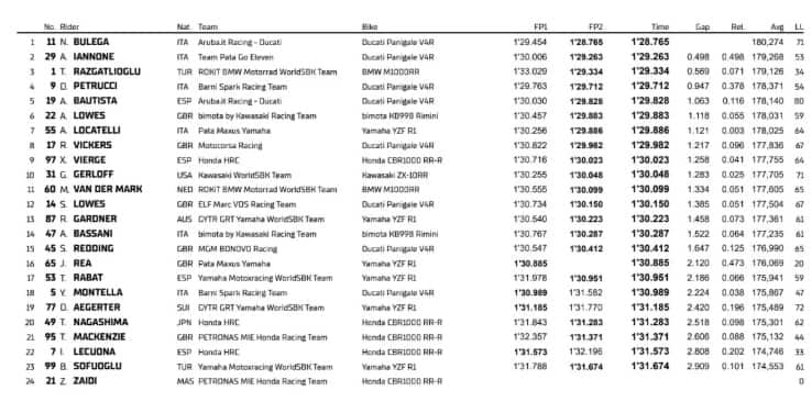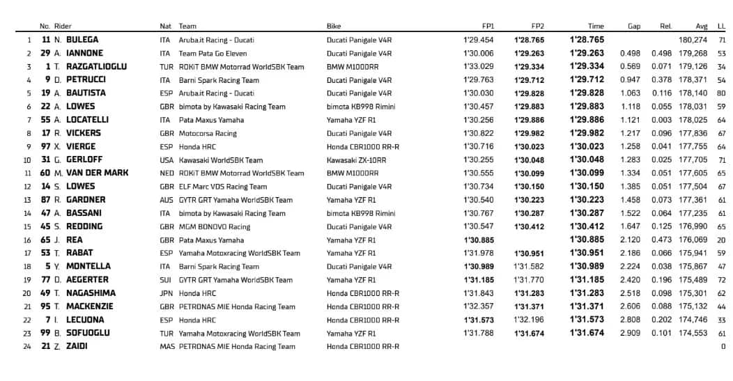 Parte alla grande Bulega: in mattinata ha girato 1’29”454, nel pomeriggio si è migliorato con un 1’28”765° a due decimi circa dal record della pista (che lui stesso detiene dallo scorso anno). Staccati di mezzo secondo Iannone e Razgatlioglu caduto nella prima parte dei test. Petrucci quarto davanti a Bautista, Lowes e Locatelli. Rea a terra: fratture multiple alla caviglia sinistra e niente primo round del Mondiale