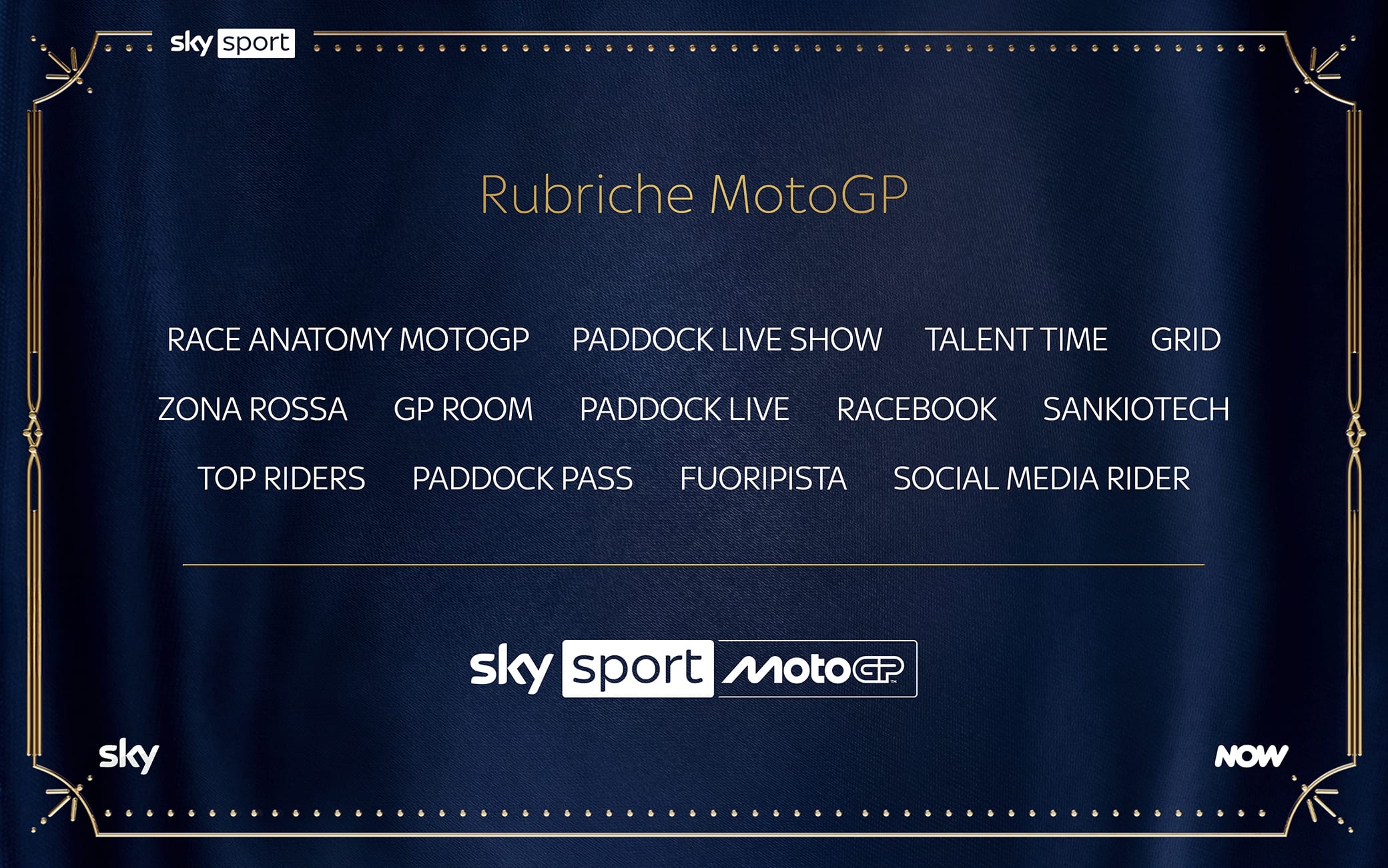 Il palinsesto di Sky Sport MotoGP, canale 208, disponibile in streaming su NOW, si completerà durante la settimana con i format che hanno avuto un grande riscontro nel pubblico degli appassionati: Social Media Rider, il programma di Rosario Triolo che racconta la vita social di piloti e addetti ai lavori del Motomondiale con ironia e fantasia; Wheels, condotto da Guido Meda e dedicato alle prove su strada e su pista di auto e moto di produzione e da corsa; grazie a Top Riders, Talent Time e Paddock Pass il passato, il presente, il futuro del mondo delle due ruote troverà il giusto spazio. Il coordinamento editoriale è firmato da Massimo Battiston.