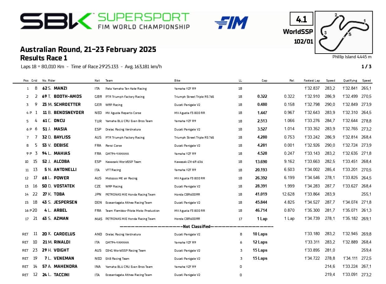 Nella classe Supersport Stefano Manzi ha aperto in maniera vincente la storia sportiva della Yamaha R9, emergendo in una bella gara di gruppo e battendo sul traguardo il rookie Jaume Masià; lo spagnolo, però, è stato retrocesso al sesto posto per aver infranto il tempo minimo del pit stop. Ad ereditare la seconda piazza è stato Tom Booth-Amos su Triumph, con Marcel Schroetter terzo alla prima gara su Ducati.