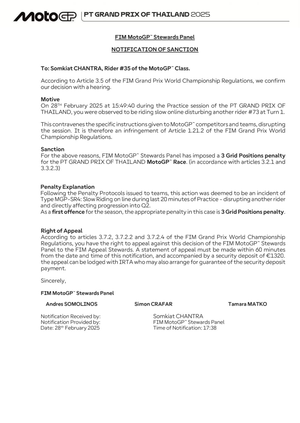 Il dispositivo della penalità per Somkiat Chantra