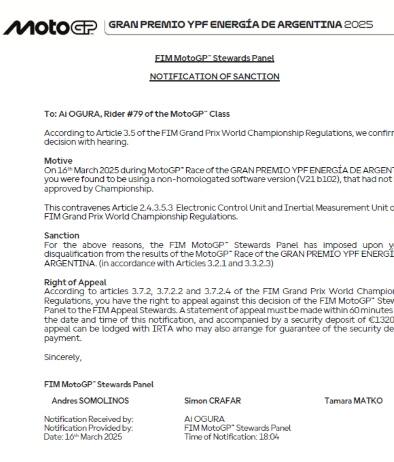 era 8°Ai Ogura è stato squalificato dal Gran Premio d'Argentina, gara che aveva chiuso all'ottavo posto (ancora una volta la migliore delle Aprilia). Il motivo della sanzione? L'utilizzo di una versione del software della centralina non omologata dal campionato. Cambia così l'ordine d'arrivo a Termas de Rio Hondo, con Luca Marini che entra in top ten