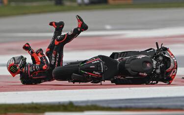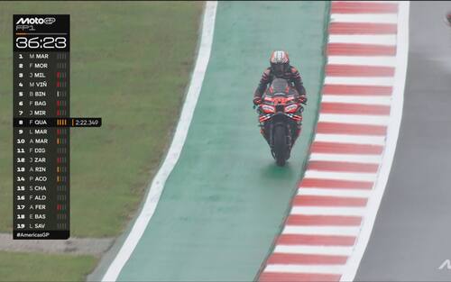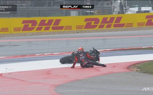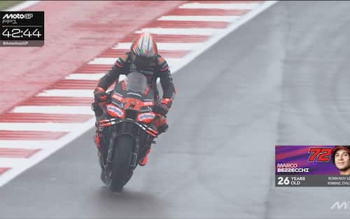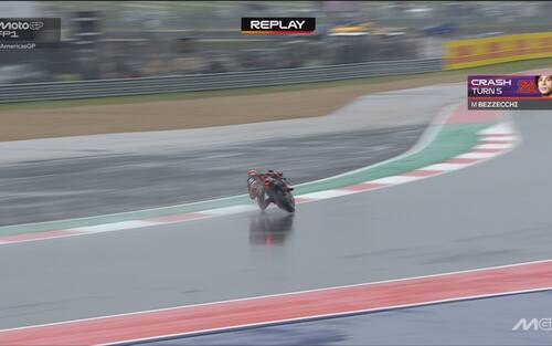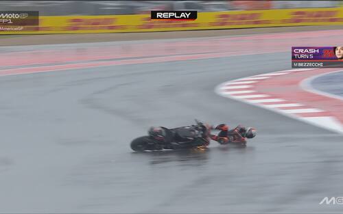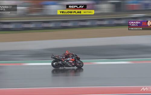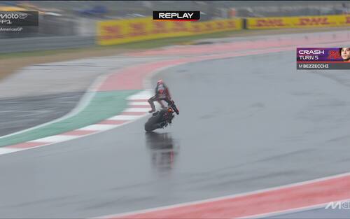 - Rientrato in pista e ripresa l'attività, l'asfato bagnato di Austin tradisce anche lo stesso Bezzecchi come fatto poco prima con Marc Marquez. Brutto high side nel serpentone (parte del primo settore) con il pilota Aprilia lanciato in aria prima del forte impatto.