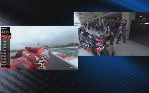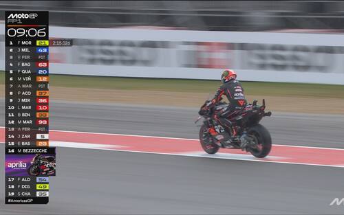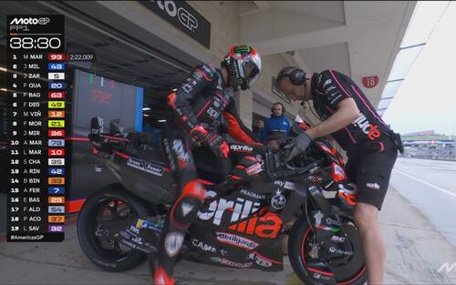 - Mentre Bezzecchi percorre gli ultimi metri prima del rientro ai box in casa Aprilia si lavora sulla seconda moto, con l'obiettivo di risolvere definitivamente il problema.