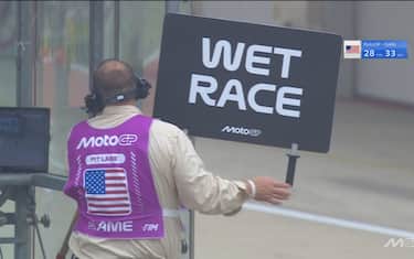 - Eppure in alcuni punti della pista continua a piovere e, secondo alcune previsioni meteo, l'intensità potrebbe aumentare. Per questo, a circa 30 minuti dal via, la gara della top class viene dichiarata bagnata. Cosa significa? I piloti possono scegliere quali gomme montare in base alle sensazioni sul tracciato, ma nel corso della gara si può cambiare in qualsiasi momento col cosiddetto 'flag to flag', un cambio di moto non previsto nelle altre categorie