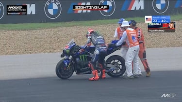- Si possono rischiare le slick? In apparenza sembrerebbe di sì, ma la situazione è piuttosto incerta. Come dimostra la caduta di Fabio Quartararo nel giro di schieramento. Per fortuna il pilota francese riesce a ripartire, grazie anche all'aiuto di 'taxi' Jack Miller, e a mettere la sua Yamaha in griglia
