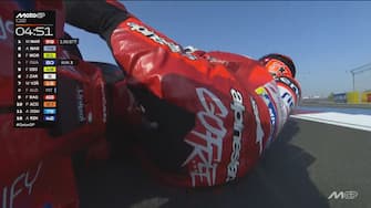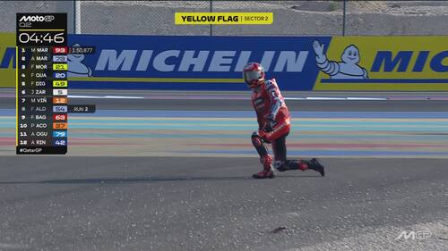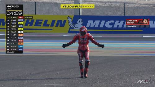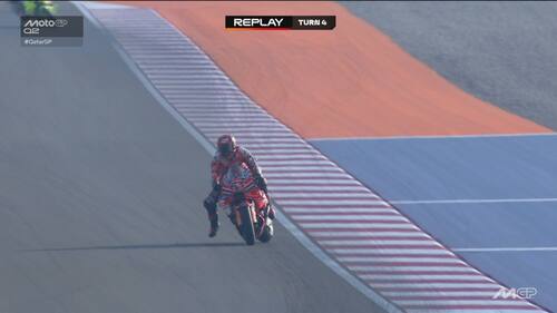 - Il pilota Ducati è stato protagonista di una caduta nel corso del Q2 di Lusail. Bagnaia è entrato molto forte in curva 4, ha perso il posteriore verso l'esterno con l'anteriore che è andato in controsterzo. L'allineamento delle due ruote ha dato l'ultimo carico sull'anteriore con il torinese che è finito a terra.