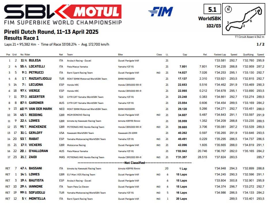 Nel sabato di Assen torna a suonare l'inno di Mameli, in virtù della vittoria di Nicolò Bulega in Gara 1 di Superbike. Ma quelle note valgono anche per Andrea Locatelli e Danilo Petrucci che completano un podio interamente italiano, così come per Ducati (Aruba e Barni) e per il gruppo di lavoro di Yamaha, basato a Gerno di Lesmo. Avendo avuto il miglior giro in Superpole "tarpato" dal traffico di Toprak Razgatlioglu e Axel Bassani (penalizzati di tre posizioni in griglia), Bulega ha preso la testa fin dal via e ha aperto un varco nei primi giri, un varco che ha continuato ad aprirsi anche quando l'italiano ha calato il ritmo. Il quarto successo in stagione lo isola a quarantuno punti di margine su Toprak, in forte difficoltà e "solo" quarto al traguardo. Il turco, infatti, è partito piano e ha dovuto lottare per risalire la china, ma non è riuscito a contenere un ispiratissimo Locatelli. Il pilota di Selvino ha confermato il feeling con la pista che gli diede il primo podio in Superbike nel 2021, tornando a podio dopo Gara 1 di Portimao. Anche Petrucci ha avuto la meglio su Razgatlioglu, fiaccandolo con un sorpasso deciso alla curva sette e confermandosi il migliore tra gli indipendenti. Rammarico, invece, per Sam Lowes: poleman a sorpresa, l'inglese di casa MarcVDS è rimasto coinvolto nella scivolata di Alvaro Bautista, che lo stava attaccando in curva otto nelle prime fasi di gara. Dietro a un Razgatlioglu in forte difficoltà chiudono le Honda di Iker Lecuona e Xavi Vierge, seppur staccate e tallonate dalle Yamaha di Dominique Aegerter e Remy Gardner. Top ten per Michael Van Der Mark e Scott Redding, mentre termina con un ritiro la gara di Axel Bassani, scivolato all'ultimo giro con la quinta posizione alla portata. Caduti anche Andrea Iannone e Yari Montella.