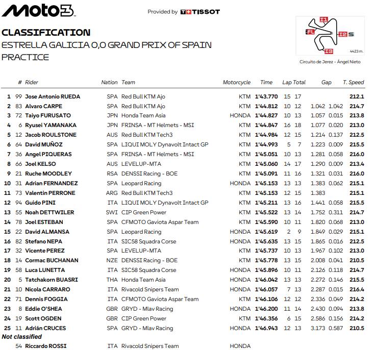 gp spagnaRueda chiude la prima giornata della Moto3 a Jerez davanti a tutti, rifilando oltre un secondo a Carpe e Furusato, rispettivamente 2° e 3°. Indietro gli italiani, con Guido Pini il migliore dei nostri piloti in 12^ posizione. Di seguito il racconto delle Pre-qualifiche e la classifica dei tempi del venerdì