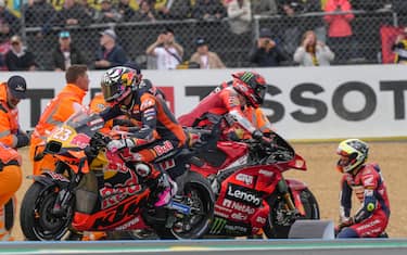 Colpo di scena al via del GP di Francia, con Bastianini che stende Bagnaia e innesca una carambola che coinvolge anche Joan Mir (finito in ospedale per accertamenti, per lui una piccola fessura alla mano e un po' di dolore al collo): il pilota Ktm è stato penalizzato con un long lap penalty da scontare nella prossima gara di Silverstone. "Sono cose che succedono", ha commentato Pecco a Sky. Di seguito la fotosequenza dell'incidente e le altre scivolate di giornata