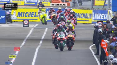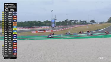 - Dopo diversi giri di caos, tra flag to flag e long lap penalty, la situazione si stabilizza: tutti i piloti sono in pista con le rain e hanno scontato le rispettive penalità. Ad approfittarne è Johann Zarco: il pilota di casa, partito con le rain e scivolato in 17^ posizione dopo il contatto al via con Mir, azzecca la strategia e si ritrova al comando della gara.