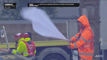 - Tutti e 22 i piloti in pista hanno deciso di rientrare per prendere la moto con pneumatici da bagnato. Motivo per il quale la direzione gara è stata costretta a esporre la bandiera rossa e posticipare la partenza.
