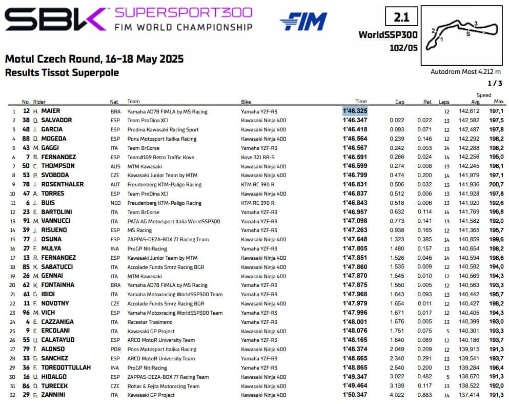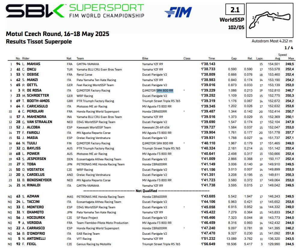 Le categorie Supersport del Mondiale Superbike hanno affrontato due sessioni di qualifica molto diverse tra loro nel venerdì di Most. Mentre la 300 ha goduto di condizioni di pista asciutta, la middle class è scattata con l'asfalto bagnato e la sua asciugatura è stata un'ulteriore difficoltà per i piloti. Con le slick montate a metà turno, la differenza l’ha fatta Lucas Mahias: il francese di casa GMT94 si è inventato un crono pazzesco negli ultimi minuti (1’38”143), rifilando quasi sei decimi al secondo e conquistando la nona pole position in carriera. A fargli compagnia in prima fila sono Can Oncu e Valentin Debise, con una seconda fila altrettanto interessante aperta da Stefano Manzi, capace di risistemare la sua sessione proprio negli ultimi istanti; quinto un rampante Philipp Oettl seguito dalla vera sorpresa di giornata, ovvero Raffaele De Rosa a bordo della QJ Motor SRK 800 RR. Buon nono posto per Federico Caricasulo, quattordicesimo Filippo Farioli. Fa rumore il ventitreesimo posto del secondo classificato in campionato, Bo Bendsneyder.