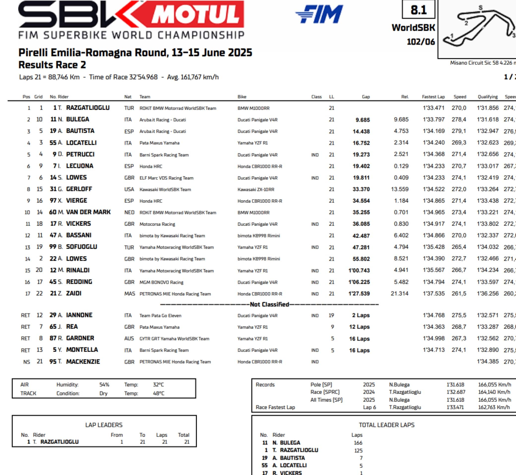 sbkRazgatlioglu completa un weekend perfetto con tre vittorie a Misano. In Superpole Race Bassani fa cadere Bulega, che chiude secondo in Gara 2. Primo podio per il nuovo corso di Bimota con Lowes nella Sprint, sugli scudi anche Bautista e Locatelli