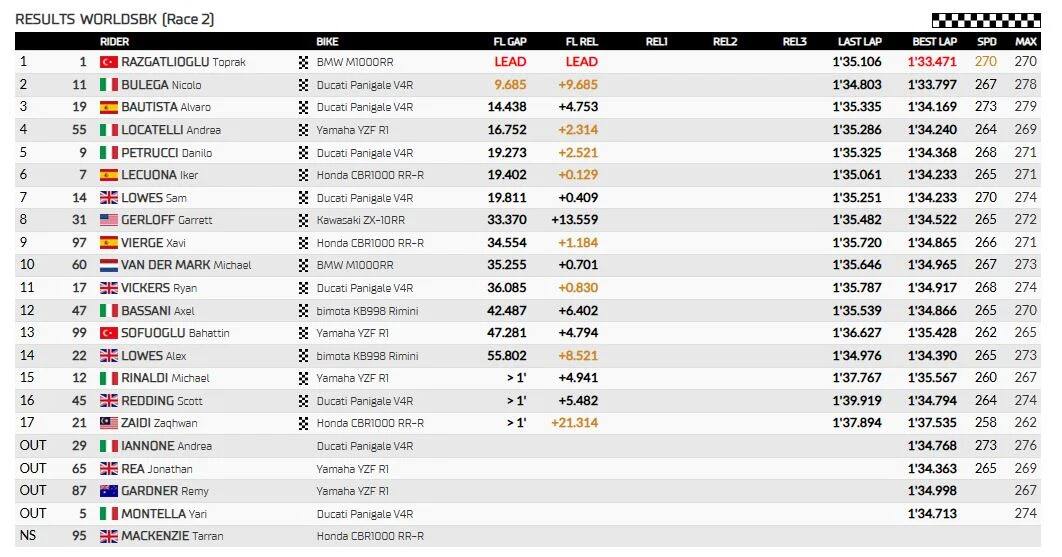 Nel pomeriggio, la vittoria di Gara 2 è stata un affare solitario per Razgatlioglu, che con un ritmo impressionante è scappato in fuga e ha inflitto quasi dieci secondi di distacco a Bulega, secondo. Chiaramente la gara dell'italiano è stata complicata dalla partenza in decima posizione, che lo ha costretto a risalire nelle prime fasi di gara. In una domenica non entusiasmante per Ducati Aruba arriva la piccola soddisfazione del doppio podio, perché al terzo posto ha chiuso Bautista, all'ultima gara in rosso a Misano. Locatelli ha cercato di stare con lo spagnolo per contendergli il podio, ma senza successo. Il suo quarto posto lo pone davanti al terzetto di Petrucci, Lecuona e Sam Lowes, mentre l'altro gemello Alex è scivolato così come Rea e Iannone. Miglior risultato in stagione per Garrett Gerloff, ottavo davanti a Xavi Vierge e Michael Van Der Mark. Bassani conclude mestamente dodicesimo dopo un doppio long lap di penalità, quindicesimo Rinaldi.