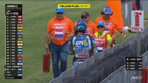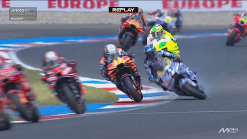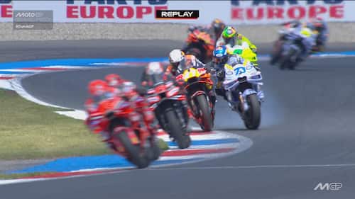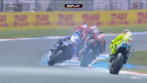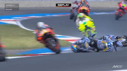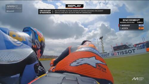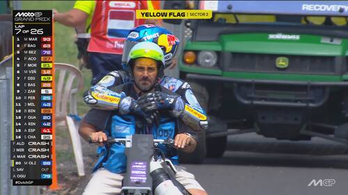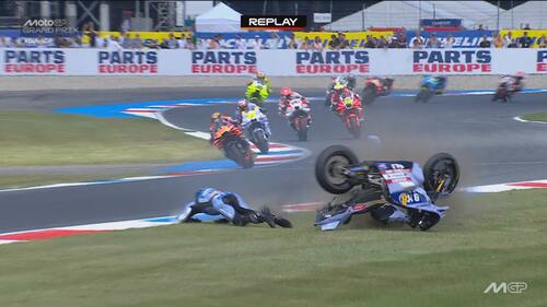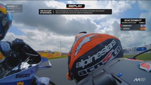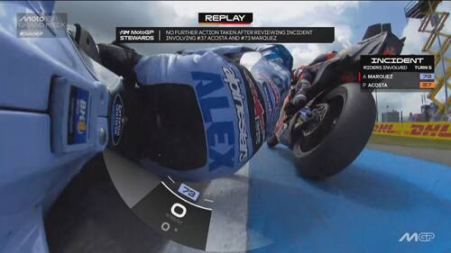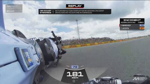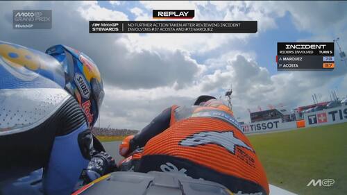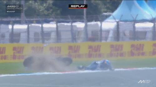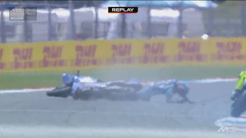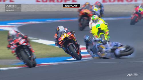 - Sulla dinamica: "C'è stato un contatto, credo con la gamba o la parte posteriore della moto di Acosta, sulla parte destra del manubrio e sul freno anteriore. Si vede anche dai dati una pinzata molto importante che ha bloccato la ruota e ha causato la caduta. Il colpo è stato molto forte, a circa 170 km/h, si è strappato anche il paraleva e c'è stata la pinzata sul freno anteriore".