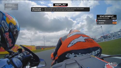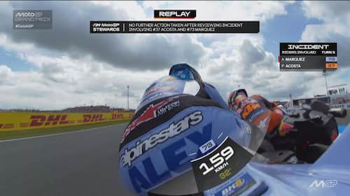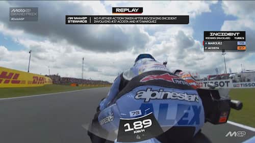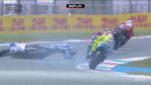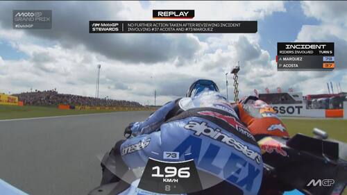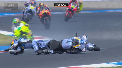 Infortunio per Alex Marquez ad Assen. Il pilota del team Gresini durante il 6° giro si è toccato con la Ktm di Acosta ed è finito a terra. Lo spagnolo, apparso subito dolorante alla mano sinistra, è andato al centro medico dove si è sottoposto a degli esami che hanno evidenziato una frattura scomposta del secondo metacarpo. E' stato operato nella tarda serata di domenica. Di seguito la fotosequenza