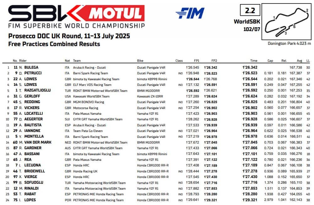 L'inizio del weekend di Donington del mondiale Superbike parla italiano grazie alla prima posizione di Nicolò Bulega nelle prove libere. Nonostante una scivolata incruenta alla curva Fogarty in FP2, infatti, il leader del campionato ha fermato il cronometro in 1'26"342 conquistando la vetta della classifica del venerdì. Su una pista storicamente favorevole a Toprak Razgatlioglu, è un risultato più che significativo che fa ben sperare per un fine settimana divertente.