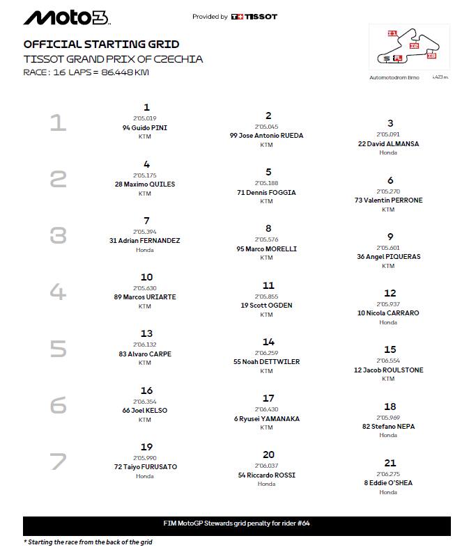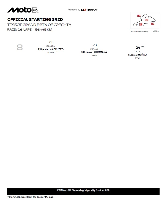 Moto3, la griglia di partenza del GP in Repubblica Ceca