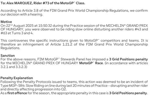 - "Sei stato osservato procedere lentamente in pista, disturbando un altro pilota #63 (Bagnaia) alla curva 3. Per i motivi indicati, lo Steward Panel ha imposto una penalità di 3 posizioni in griglia per la gara MotoGP".