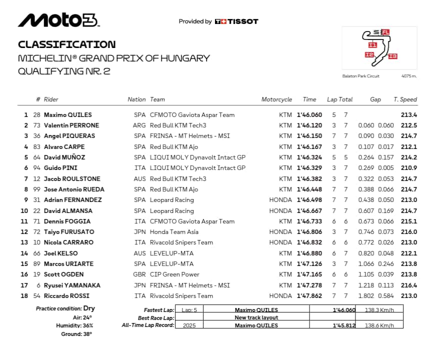 gp ungheriaMaximo Quiles conquista la seconda pole stagionale in Moto3, confermandosi tra i più in forma. Alle sue spalle Valentin Perrone e Angel Piqueras. José Rueda, in calo, partirà 8°. Guido Pini, primo degli italiani, scatterà 6°: "Siamo pronti, ma manca qualcosa sul passo". Foggia 11°, Carraro 13°, Rossi 18°. Nepa chiude il gruppo con il 26° tempo