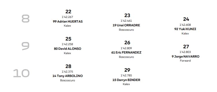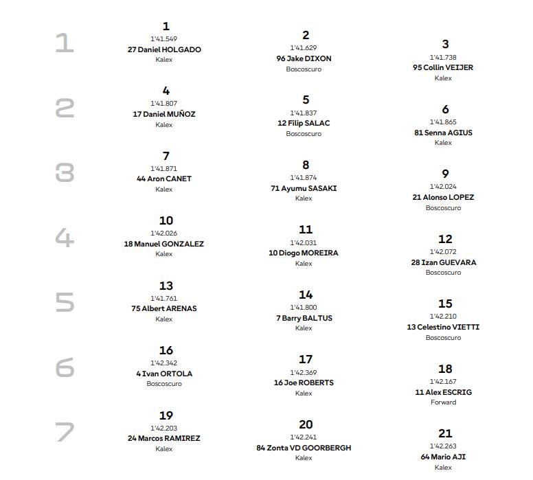 Chi s’aspettava una lotta tra Gonzalez, Canet e Moreira, i protagonisti del campionato, è rimasto deluso. Il leader della classifica, Gonzalez, ha chiuso in dodicesima posizione; Moreira non ne ha approfittato, finendo alle sue spalle; Canet, diretto avversario dello spagnolo nella corsa al titolo, è finito poco più avanti, al nono posto. Partono tutti e tre vicini, e in chiave campionato sarà interessante osservare anche il confronto tra loro tre.