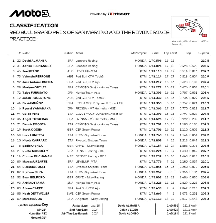 Parte bene il Team Leopard. Almansa e Fernadez davanti a tutti nella prequalifica di Misano. David se l'è preparata con cura, veloce per tutto il turno, ha segnato il miglior tempo da solo, rifilando mezzo secondo al compagno di squadra. Quindi Kelso e Perrone, migliore dei rookie, quinto il leader del mondiale Rueda, sempre in controllo a inizio week end. Il suo avversario diretto Piqueras, vincitore a Barcellona, è staccato di tre decimi, in dodicesima posizione. In Q2 vanno anche Munoz (9°) e Furusato (7°) che al Montmelò avevo chiuso la gara al terzo posto e in questa occasione ha è finito alle spalle di Quiles (6°). Il migliore degli italiani è stato Guido Pini (11°), che va diretto in Q2 insieme a Foggia (13°), non particolarmente brillante ("non m'aspettavo di faticare tanto ma sono scivolato subito"), ma soddisfatto dell'obiettivo centrato ("era fondamentale assicurarsi la Q2"). Fuori dai quindici è invece rimasto Luca Lunetta, 15° per 54 millesimi, rientrato alle corse in Spagna, dopo quasi tre mesi di convalescenza per l'infortunio in Olanda. Anche Carraro (16°) e Nepa (22°) dovranno passare dal Q1, insieme ad Alvaro Carpe, bloccato al box da un problema tecnico.