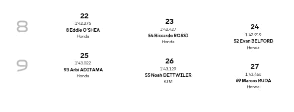 Almansa ha chiuso 13°, Pini (che nel 2026 passerà al team Leopard) 16°, Quiles 9°. Lunetta, passato dalla Q1, ha commesso qualche errore (inclusa una scivolata) e ha faticato in Q2, finendo al 14° posto ("Sto meglio rispetto a Barcellona, ma mi manca ancora qualcosa"). Comunque meglio del suo compagno di squadra Nepa (18°), in difficoltà da diverse gare. Non bene nemmeno gli altri italiani: 12° Foggia, 19° Carraro, 23° Rossi.