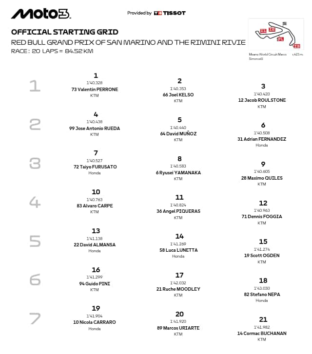 GP SAN MARINOSeconda pole stagionale per Perrone al debutto in Moto3, davanti a Kelso e al compagno di squadra Roulstone. Rueda, solido leader del Mondiale, è 4° e tiene a distanza Piqueras, solo 11° dopo una qualifica complicata. Almansa (13°) cade coinvolgendo Pini (16°). Quiles 9°, Lunetta 14° dopo una scivolata. Nepa 18°, in difficoltà. Foggia 12°, Carraro 19°, Rossi 23°