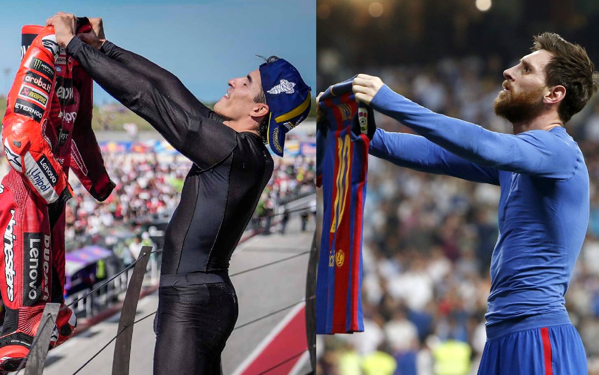 Marc Marquez come Leo Messi. Sfila la tuta rossa, la mostra al pubblico di Misano ed esulta così sul podio dopo l'11° trionfo stagionale. Una citazione d'autore, che ci riporta a un Clasico Real Madrid-Barcellona 2-3 del 2017, quando la Pulce, con una doppietta, trascinò i blaugrana alla vittoria al Bernabeu e poi, senza timori, mostrò nella Casa Blanca la sua maglietta numero 10.