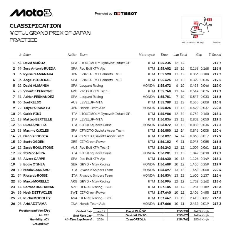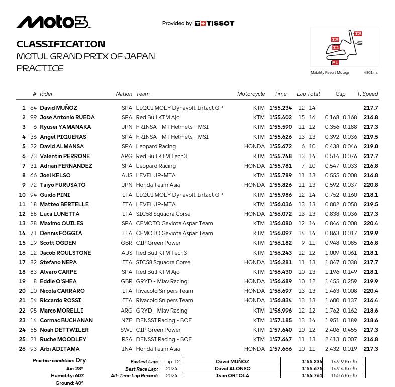 GP GIAPPONEDavid Munoz ha conquistato il primo posto nelle Pre-qualifiche del GP del Giappone, approfittando della scia di Antonio Rueda e con Piqueras che ha chiuso due posizioni dietro. Bene Almansa, nonostante due cadute, e Perrone, sesto. Quiles ha rischiato di restare fuori dalla Q2 chiudendo 13°. Grande rientro per Matteo Bertelle, 11°, dopo cinque mesi di stop a causa di un infortunio