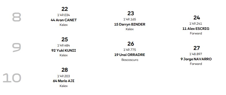 Celestino Vietti, sull’onda della vittoria nella gara di casa a Misano, ha conquistato un promettente quarto posto, davanti al brasiliano di Italtrans, e a Joe Dixon che in mattinata aveva chiuso in testa la Fp2. Settimo Baltus (che in campionato potrebbe ambire quantomeno al secondo posto, da cui è staccato di 15 punti), ottavo Sasaki, fermato da una scivolata. Arbolino, partito con un passo migliore venerdì (dopo essere stato operato di sindrome compartimentale, subito dopo il gran premio di Misano), ha però concluso la sua qualifica con l’undicesimo tempo. Joe Roberts, dopo la fiammata del primo giorno di prove, ha fatto anche peggio, finendo in quindicesima posizione, davanti ad Alonso Lopez, Munoz e Salac caduto a inizio turno.