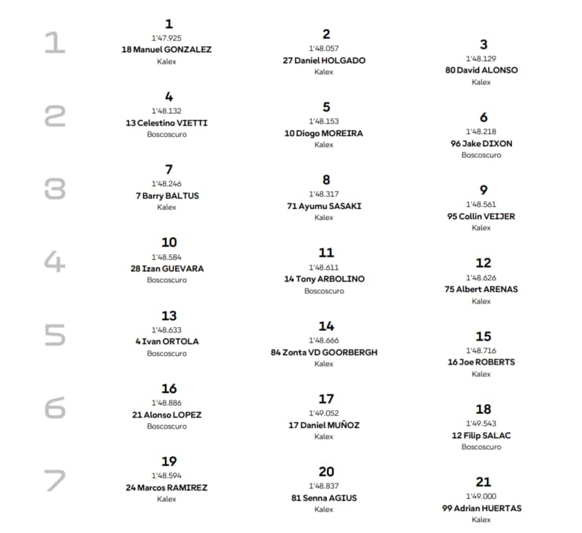 Solido ed efficace nei momenti che contano, Manu Gonzalez ha messo quattro moto tra sé e il diretto inseguitore in classifica, Diogo Moreira (appena confermato in Motogp dal prossimo anno, con la Honda LCR), prima vera preoccupazione in questa gara, visto il disastro di Canet, rimasto imbrigliato in Q1 (dopo la caduta di venerdì in Pre-qualifica) e obbligato a partire dalla ventitreesima casella. Settima pole con record della pista per lo spagnolo, sempre al comando del mondiale; in prima fila con lui finiscono anche due rookie, Daniel Holgado e David Alonso.