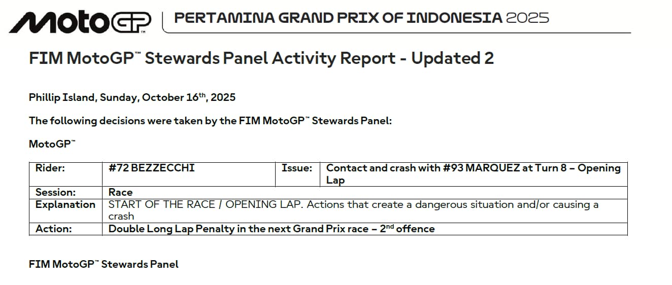 Alla vigilia di Phillip Island Bezzecchi ha parlato coi media tornando sull'episodio di Mandalika: "Non mi aspettavo di essere così veloce in quel punto, purtroppo ho fatto un errore di valutazione. Ho cercato di evitare il contatto, ma non ce l’ho fatta. Ho toccato la parte posteriore della moto di Marc e la conseguenza è stata enorme perché in quel punto c’era una grande distanza tra l’asfalto e la ghiaia e purtroppo Marc ha colpito la ghiaia e si è infortunato". Poi a Sky sul doppio long lap penalty: "Questa è stata la decisione e non posso fare altro che rispettarla, cercare di guardare avanti e fare il meglio nonostante questa penalità".