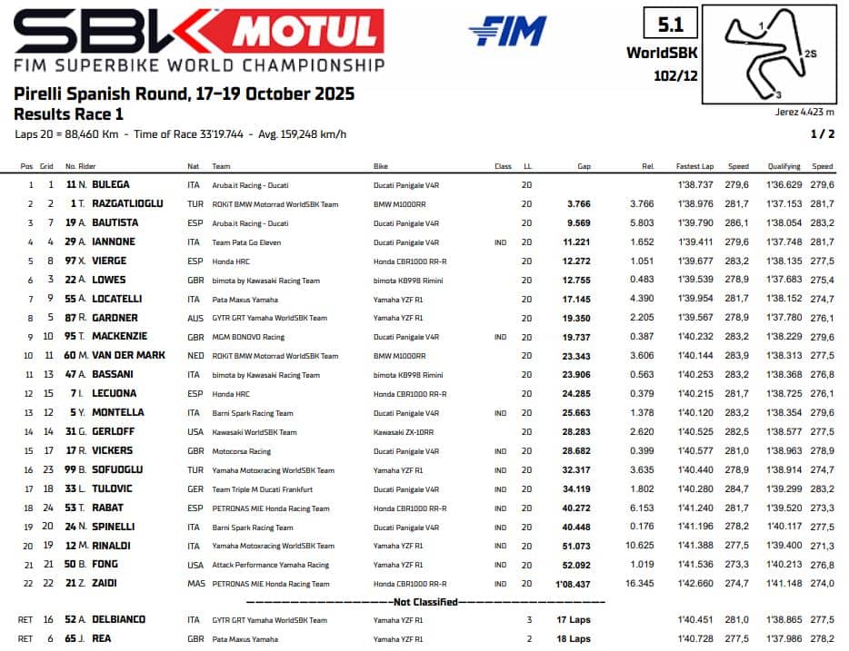 In Gara 1 Bulega ha immediatamente messo metri e secondi tra sé e gli altri, in particolare Razgatlioglu che nei primi chilometri ha dovuto battagliare con Andrea Iannone perdendo contatto col suo rivale per il campionato. Intoccabile, l’italiano ha conquistato la dodicesima vittoria dell’anno davanti al turco, rimandando a domani (con tutta probabilità in Superpole Race) la sua festa titolata. Alle spalle di Razgatlioglu si è piazzato di nuovo Alvaro Bautista, che ha rimontato dall’ottava casella sulla griglia di partenza e ha ingaggiato una bella lotta con Iannone, Xavi Vierge e Alex Lowes (giunti al traguardo in quest’ordine dal quarto al sesto posto).