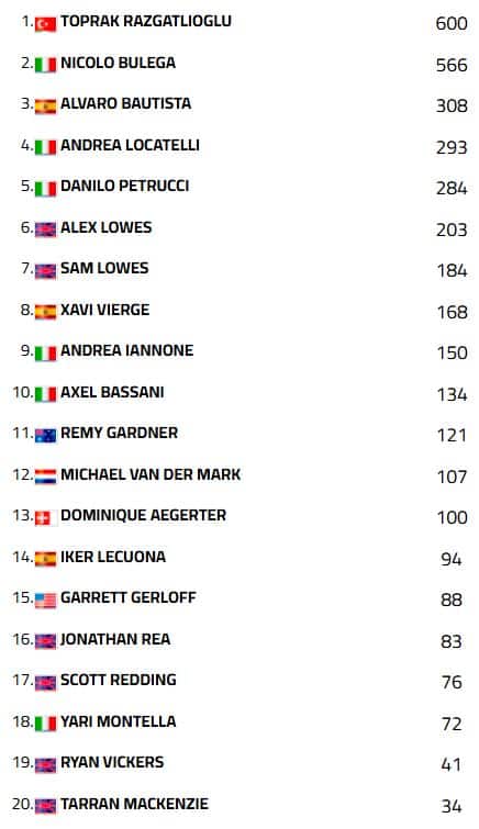 Bautista guadagna punti su Andrea Locatelli (settimo) e porta il suo margine a quindici lunghezze nella sfida per il terzo posto in campionato. Ottavo posto in gara per Remy Gardner davanti a Tarran Mackenzie, con Michael Van Der Mark a chiudere la top ten. Undicesima posizione per Axel Bassani, a punti anche Yari Montella, tredicesimo. Con la caduta di Alessandro Delbianco, tra gli italiani arrivano al traguardo Nicholas Spinelli al diciannovesimo posto e Michael Ruben Rinaldi subito alle sue spalle. Caduto anche Jonathan Rea, al suo ultimo weekend in Superbike prima del ritiro dalle corse a tempo pieno.