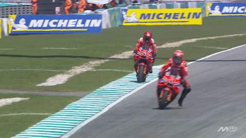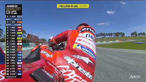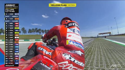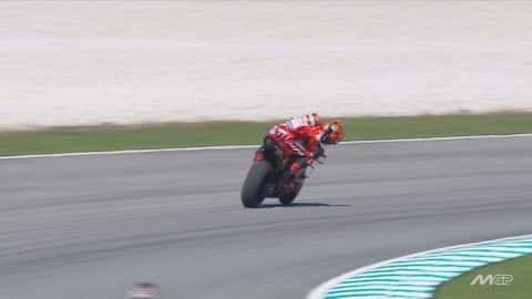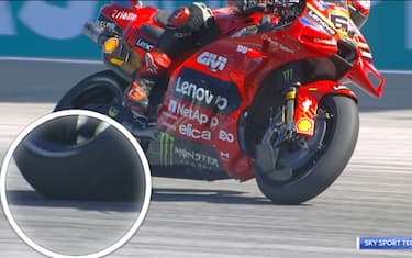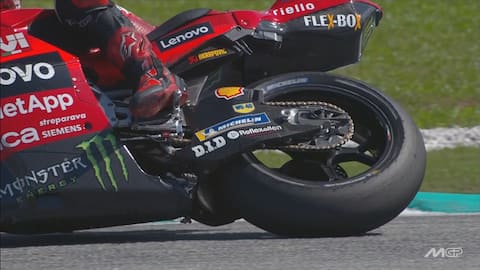Bagnaia è stato tradito da una foratura durante il GP di Sepang. Il torinese ha rallentato di colpo a 3 giri dalla fine mentre era in 3^ posizione a causa di un problema allo pneumatico posteriore. Bagnaia: "Purtroppo ho bucato. Abbiamo visto dai dati che la foratura è arrivata al 12° giro e stava perdendo pressione". Taramasso, responsabile Michelin: "Aveva una foratura al centro della gomma posteriore. Abbiamo trovato proprio il buco, un pezzo di carbonio o qualcos'altro"