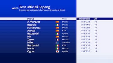 Nell'ultimo giorno dei test di Sepang, alcuni piloti hanno svolto una simulazione della Sprint Race sulla distanza dei 10 giri. "Tris" di Ducati GP26 in testa con Alex Marquez che ha avuto il miglior passo gara, seguito da Pecco Bagnaia e Marc Marquez. A seguire la Ktm di Acosta, l'Aprilia di Bezzecchi e la Honda di Mir. Di seguito i cronologici di tutti i giri e il tempo medio di ogni pilota