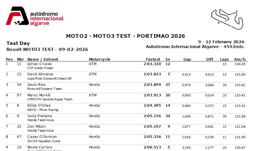 Nel 2026 il regolamento sui test Moto2 e Moto3 cambia e perdere una giornata ufficiale non dà il diritto a recuperarla. Ma in ogni caso la maggior parte dei piloti Moto3 ha preferito evitare rischi e non è andata in pista nel primo giorno di prove a Portimão a causa della pioggia. Soltanto dieci piloti hanno deciso di andare comunque in pista per mettersi alle spalle l'inverno, ma ovviamente girare sul bagnato non li preparerà all'inizio stagione, serve più che altro a riprendere contatto con gli automatismi della moto da corsa rispetto a quelle che hanno usato durante gli allenamenti.