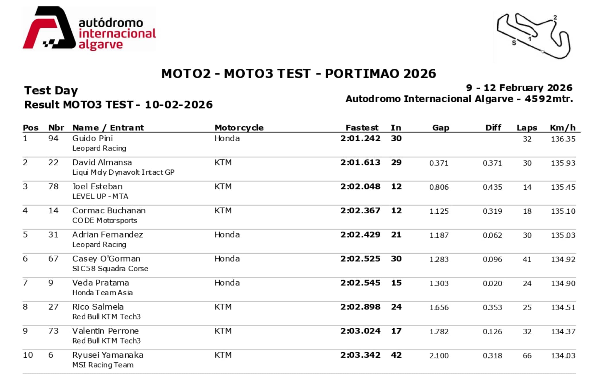Guido Pini davanti a tutti a Portimao nel secondo e ultimo giorno di test portoghesi della Moto3. Un vero disastro per i piloti e i team, il maltempo non ha permesso di lavorare veramente sui setup e di preparare la stagione, e il nuovo regolamento sui test non consente di recuperare giorni eventualmente perduti, quindi chi non è sceso in pista non avrà modo di rimandare questa giornata a un altro momento della stagione. Alle spalle di Pini l'ex Leopard Almansa, ora con IntactGp, e poi Joel Esteban di LevelUp MTA, che ha fatto solo 12 giri ma è stato velocissimo. Il suo compagno Matteo Bertelle non è andato in pista, l'altro italiano Nicola Carraro, di Snipers, ha chiuso tredicesimo a due secondi e mezzo.