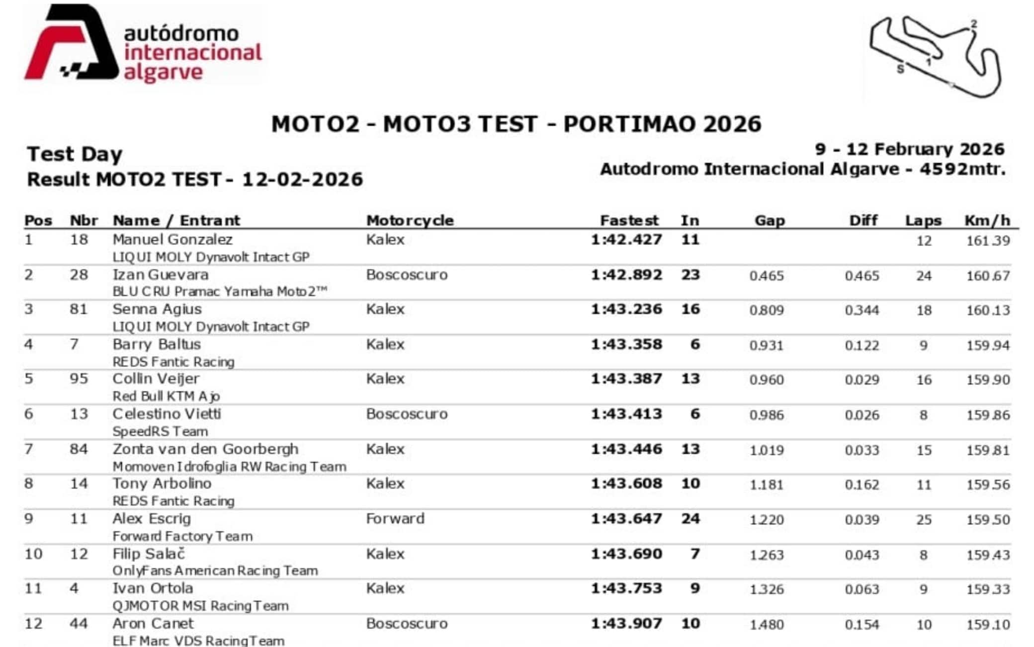Il più veloce fino alla sospensione era stato il vicecampione in carica Manu González, a poco più di un secondo dal record della pista. Alle sue spalle Izan Guevara con la Boscoscuro, mentre Vietti ha chiuso sesto, Arbolino ottavo e Lunetta venticinquesimo. Molte delle novità introdotte dai costruttori Kalex, Forward e Boscoscuro non sono neanche state provate a causa del meteo. I team sperano di poter lavorare meglio nelle ultime due giornate di test prima di inizio campionato il 16 e 17 febbraio a Jerez. La Moto3 sarà in pista sullo stesso circuito il 14 e 15 febbraio.