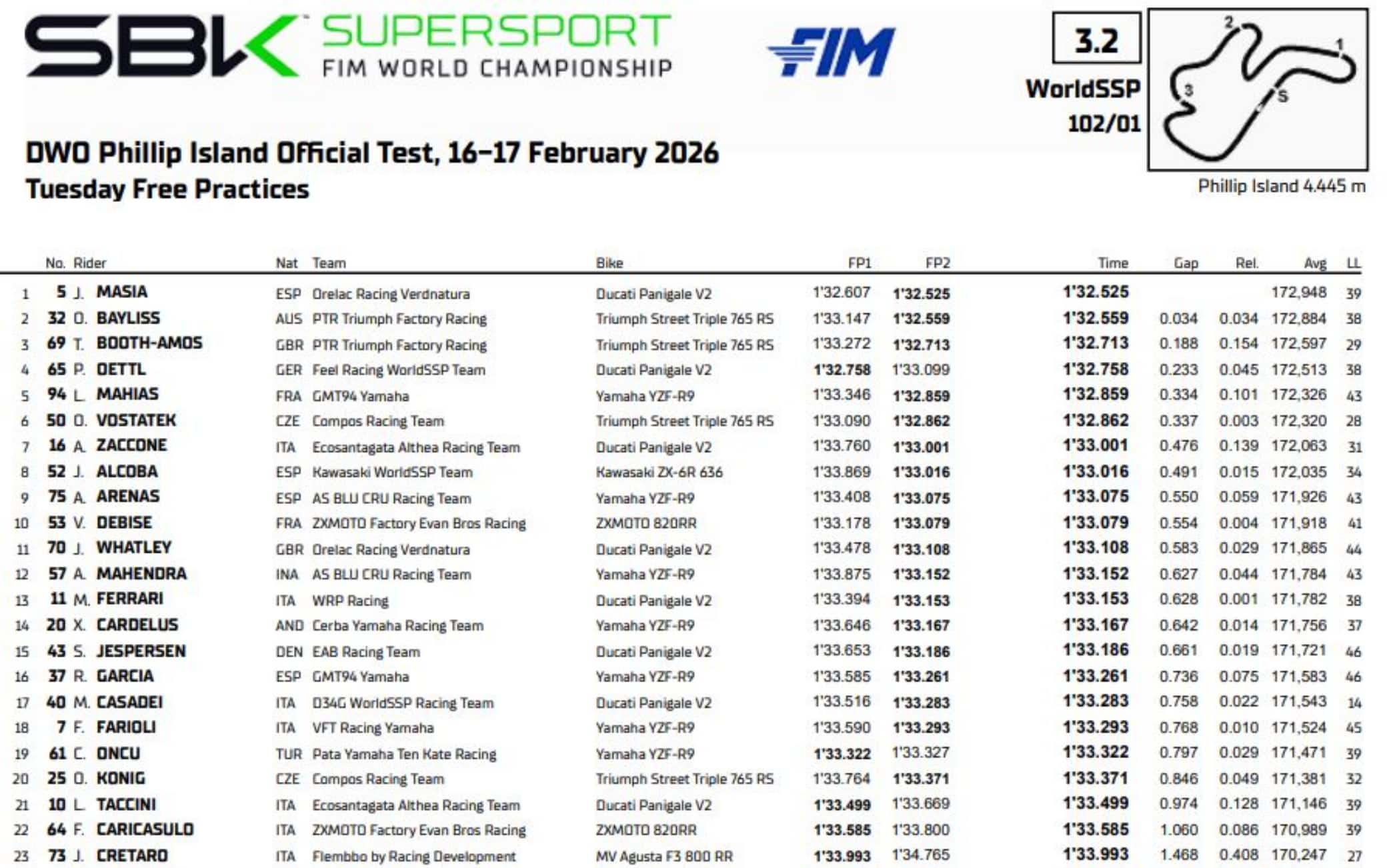 Nella classe Supersport è stato Jaume Masià a “fare il Bulega”, comandando tutte e quattro le sessioni previste nei due giorni australiani. Il pilota di Orelac Racing ha guidato il Day 2 con un miglior tempo di 1’32”525, mettendo la sua Ducati davanti alle Triumph di Oli Bayliss e Tom Booth-Amos. Sono ben tre le moto inglesi nella top 6, perché dietro a Philipp Oettl (Ducati) e Lucas Mahias (Yamaha) c’è Ondrej Vostatek con la moto di Compos Racing. Settimo il migliore degli italiani, Alessandro Zaccone.