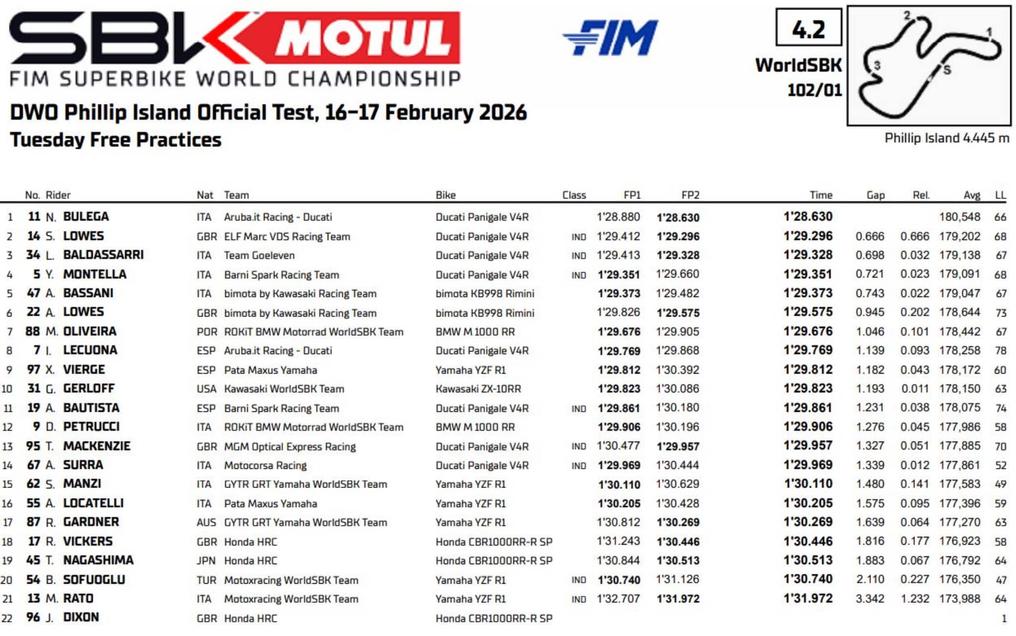 Si chiude nel segno di Nicolò Bulega e Ducati la due giorni di test Superbike a Phillip Island, sede nel weekend in arrivo del primo round stagionale. L’italiano di casa Aruba.it - Racing ha messo in chiaro la sua superiorità girando con agio sul passo del 1’29” ed essendo l’unico a spingersi più in basso di quel limite, con un miglior giro in 1’28”630. Bulega non ha deluso le alte aspettative, che nascono non solo dai risultati delle ultime stagioni (come la tripletta dello scorso anno proprio in Australia), ma anche dall’ottima reputazione della nuova Panigale V4 R che “terrorizza” in primis gli avversari. Già lo scorso anno Ducati era stata dominante a Phillip Island e nel 2026 la solfa sembra rimasta la stessa: sono infatti quattro le Rosse davanti a tutti, con Bulega seguito (a sei decimi abbondanti sul miglior tempo) da Sam Lowes, Lorenzo Baldassarri e Yari Montella. Lì vicino anche Axel Bassani al quinto posto con la Bimota, precedendo il compagno di squadra Alex Lowes e un Miguel Oliveira settimo che finalmente si avvicina a posizioni interessanti con la sua BMW.